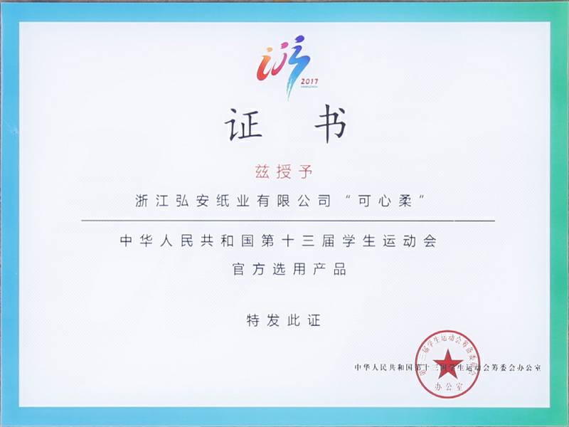 2017年9月4日中华人民共和国第十三届学生运动会在浙江杭州举行,可心柔携手中国邮政、中国平安、娃哈哈、京东校园、吉利汽车等知名企业品牌亮相大会。作为本次大会的12家合作单位之一,浙江环球体育平台登录官网(中国)官方网站纸业有限公司参加了发布会,并接受了官方选用产品的授牌。